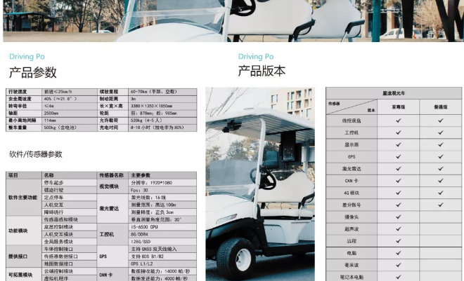 Driving Po星途智能網聯(lián)接待車是一款安全可靠的低速智能網聯(lián)車產品,可在園區(qū)等半封閉道路完成各種無人駕駛、智能網聯(lián)駕駛功能,高度還原無人駕駛、智能網聯(lián)乘用車傳感器方案,100%自主開發(fā),車輛支持硬擴展和軟件二次開發(fā)。